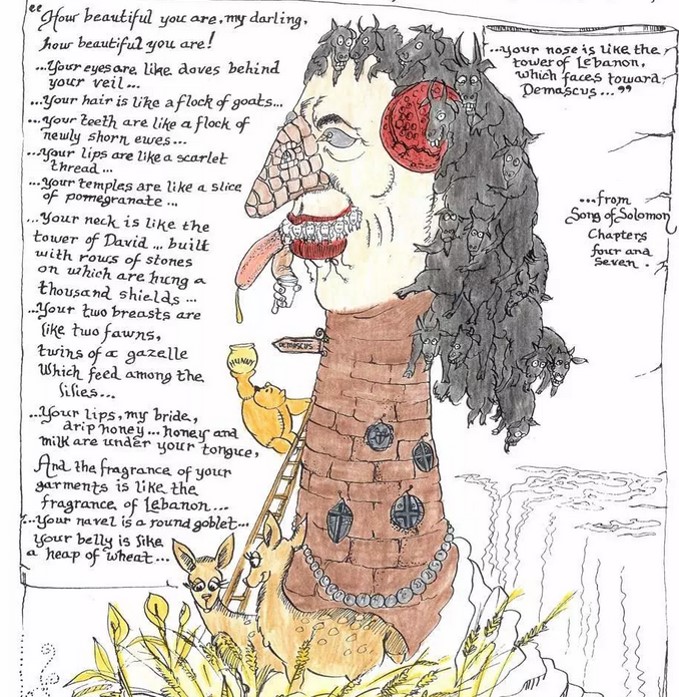 What you are looking at is a literal artistic rendering of the woman described in the Bible in the book called the Song of Solomon. This is what you get if the writer is describing this woman literally. Her neck is a tower. Her hair is a flock of goats. Her temples are slices of pomegranate.