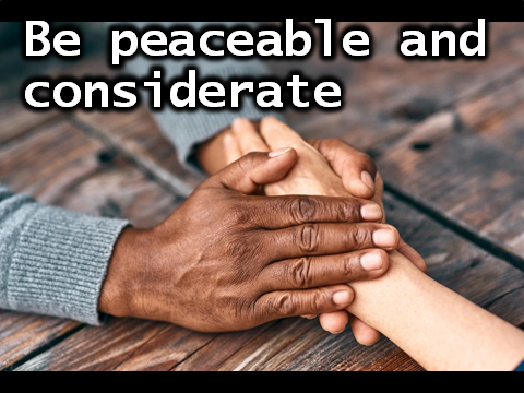 Very much related to that, Paul next says Christians are peaceable and considerate.  Christians should be peaceful, peace-loving, peace-making, people.  Our Anabaptist brothers and sisters, like the Mennonites, are really focused on this, and for good reason.  We can learn from them, because generally-speaking they have done deep study into peace-making and are much farther along than others.  We strive to make peace between genders, ethnicities, and generations.