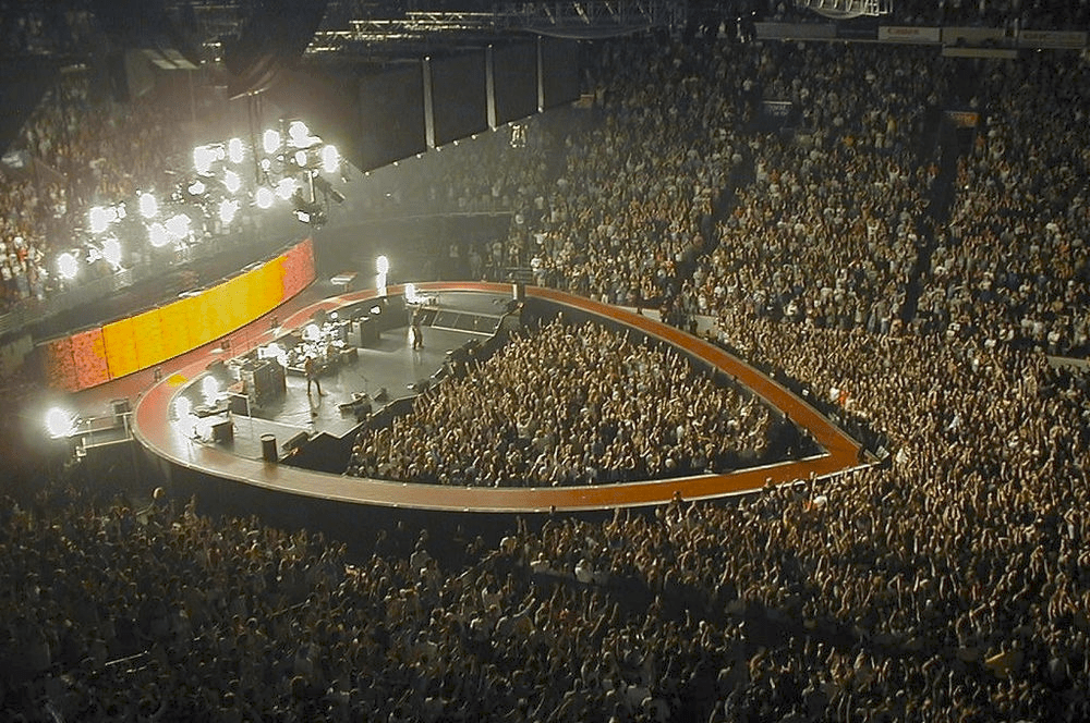 Over the excited roar of the crowd, with Edge strumming sounds like bells ringing, a bright red video wall slowly rises behind the band, and Bono quotes Psalm 116:12-14, “How can I repay the Lord for all his goodness to me? I will lift up the cup of salvation and call on the name of the Lord. I will fulfill my vows to the Lord in the presence of all his people.” Bono finishes with a prayer, “This is a toast to our Father. I’m following through on a promise I made to you.” Just then he raises his arms, lets out a guttural melodic note, and rows of bright lights wash over the arena in a near-blinding golden hue. Bono suddenly takes off running around the heart-shaped stage while singing the opening line, “I want to run…where the streets have no name.”