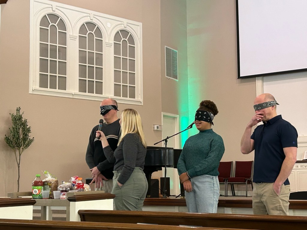 Have you ever participated in a blindfolded taste test? To introduce this sermon, we had a blindfolded taste test, inviting three volunteers to each come forward. They didn’t know it, but they were about to eat a bite of different kinds of bread and different red-colored beverage. One person had V8. Another had pumpernickel. Each delicious or repulsive, depending on your taste preferences. Our volunteers were brave and handled the test with courage, but one admitted they were nervous, wondering if we were going to feed them bugs.